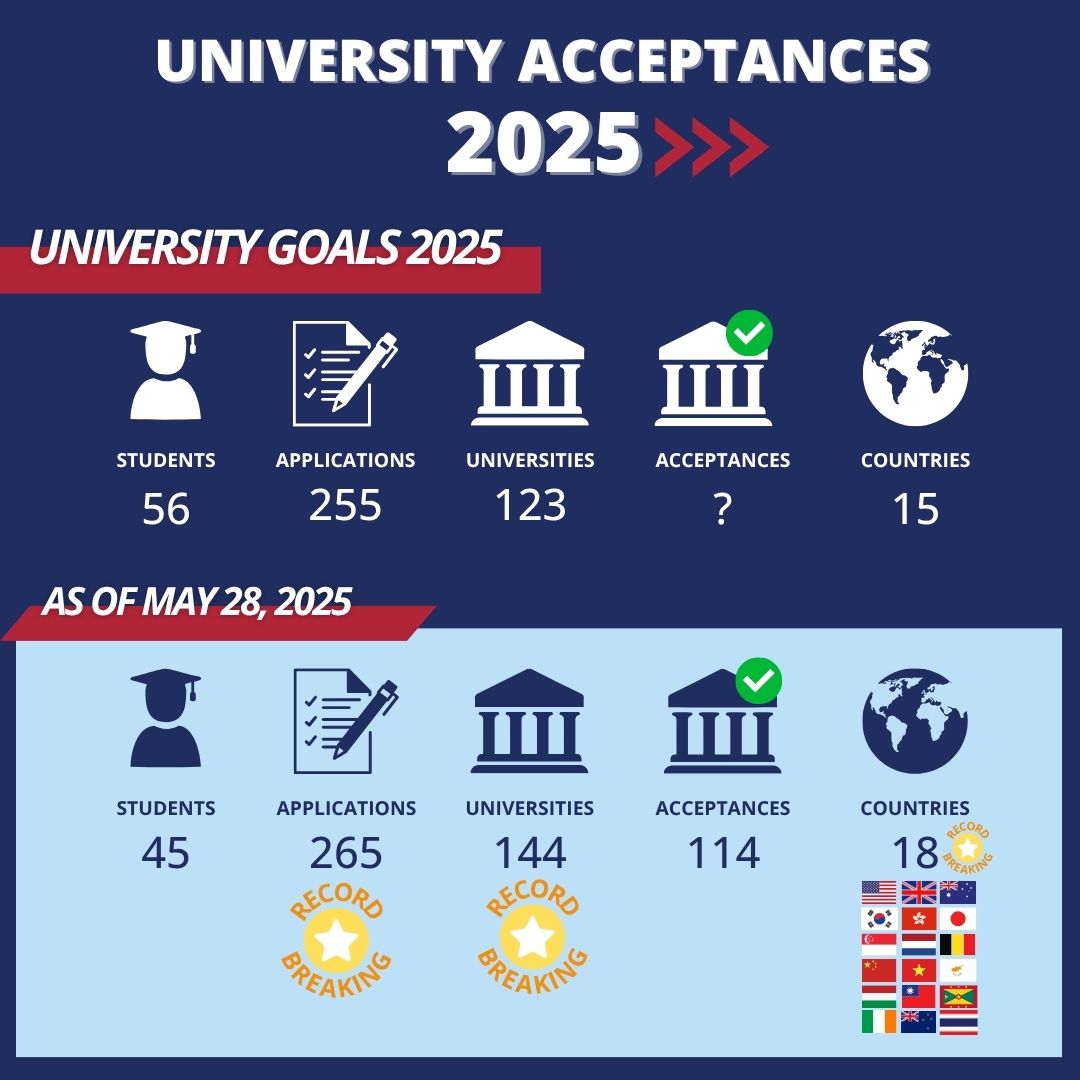 Our Eagles are getting ready to leave the nest! Our students, family, and staff are celebrating with the exciting news coming in from around the globe. Many universities abroad are sending acceptance letters to our amazing students, including prestigious colleges from the U.S., Europe, Australia, and Asia. We are so proud of the hard work from our class of ’25.
